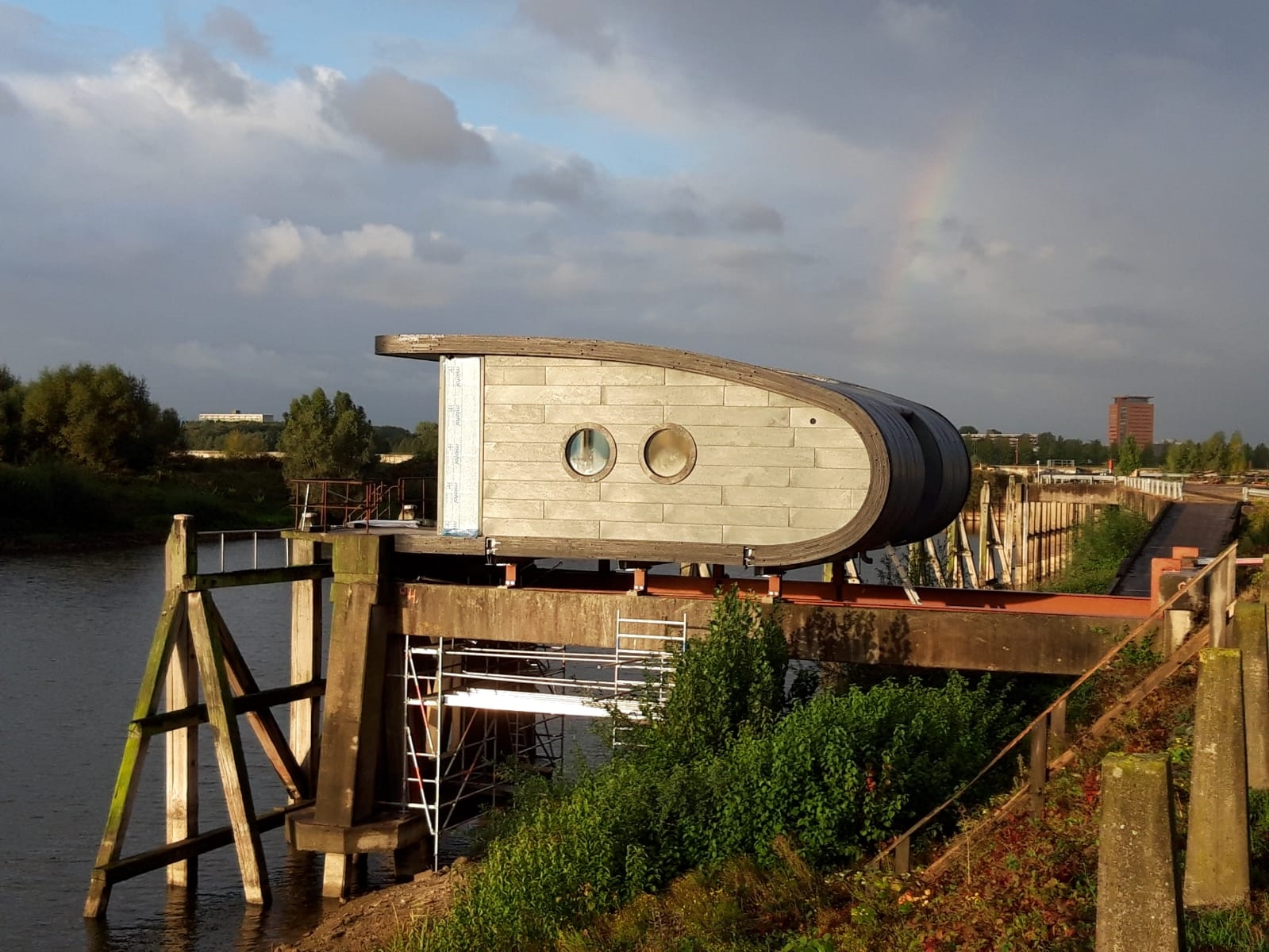 Het kantoor van de pioniers moet verrijzen op een aanlegsteiger bij de voormalige ‘Akzohaven’ van Industriepark Kleefse Waard (IPKW) aan de Neder-Rijn, zes meter boven het water. Het moet in het voorjaar klaar zijn.